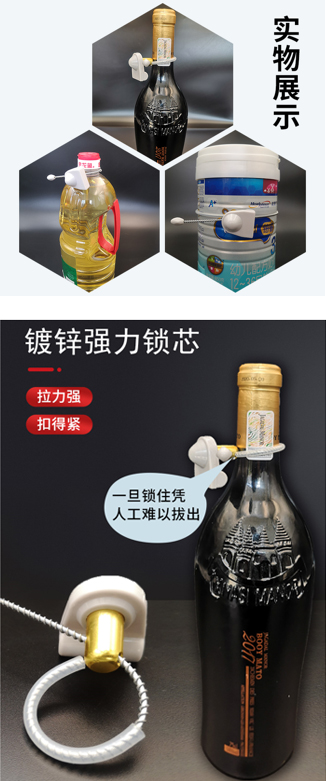 本款聲磁酒瓶扣是EAS商品防盜系統(tǒng)中一種常見耗材,主要用于超市高端酒水和紅酒防盜,一般由一個可拉伸鋼絲圈和一個帶芯片的磁扣組成,也有不同款式的。